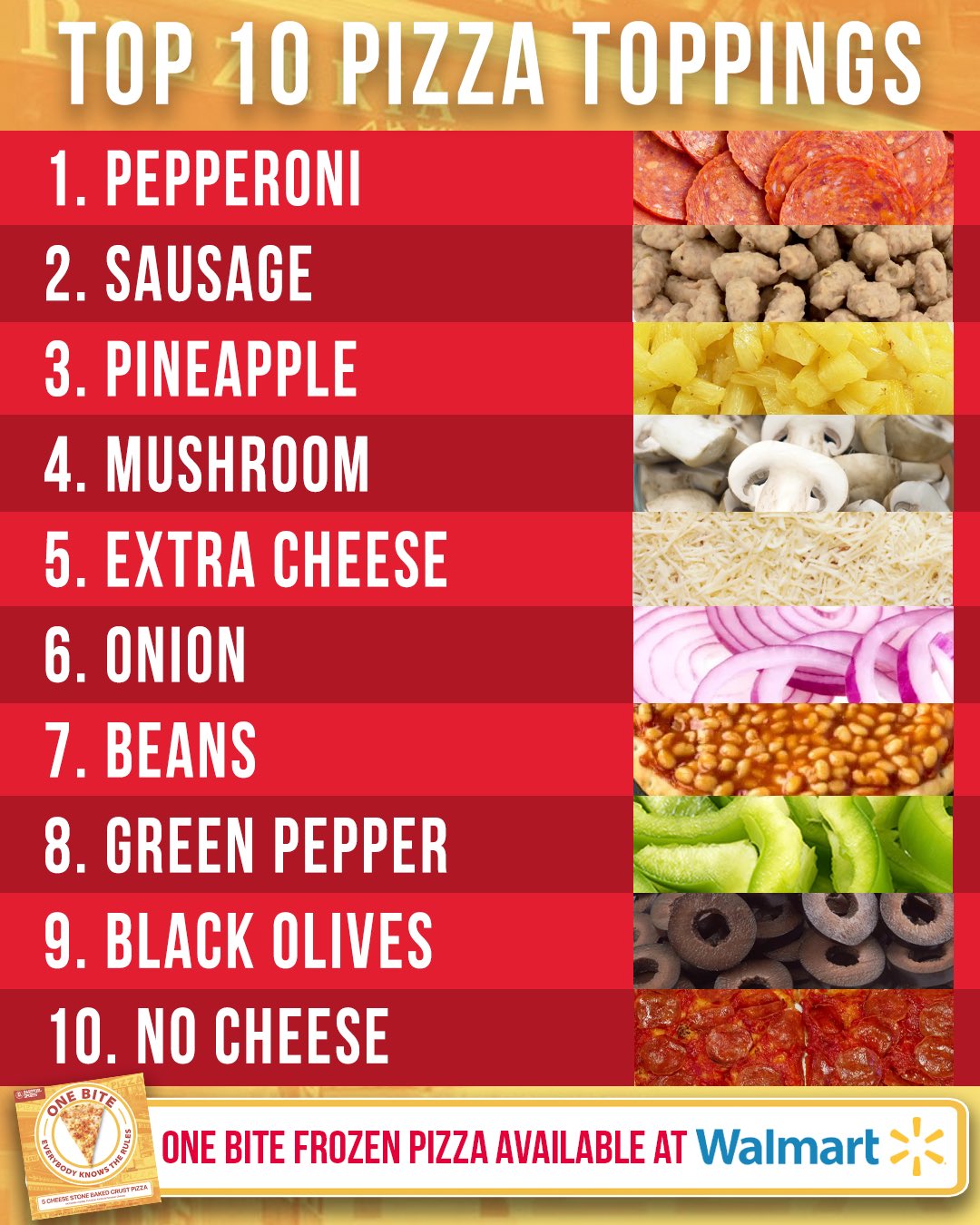 Barstool Sports On Twitter Power Ranking The Top 10 Pizza Toppings Try Onebite Pizza Available Now At Walmart Nationalfrozenfoodday Https T Co Wbxt5yylgf Twitter